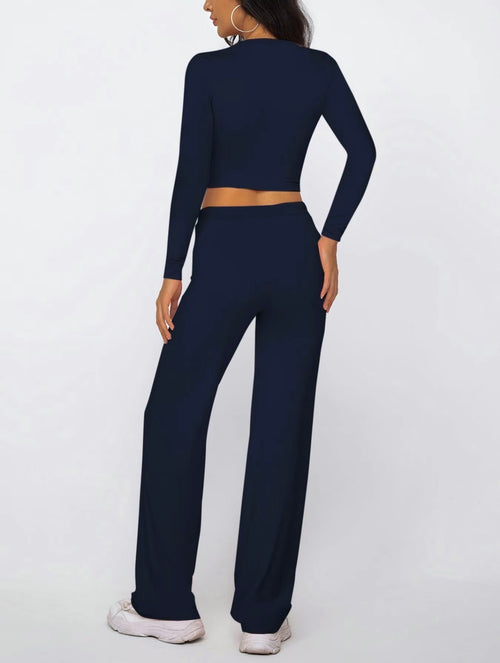 Elegant Black 2-Piece Lounge Set – Long Sleeve Top & Wide Leg Pants